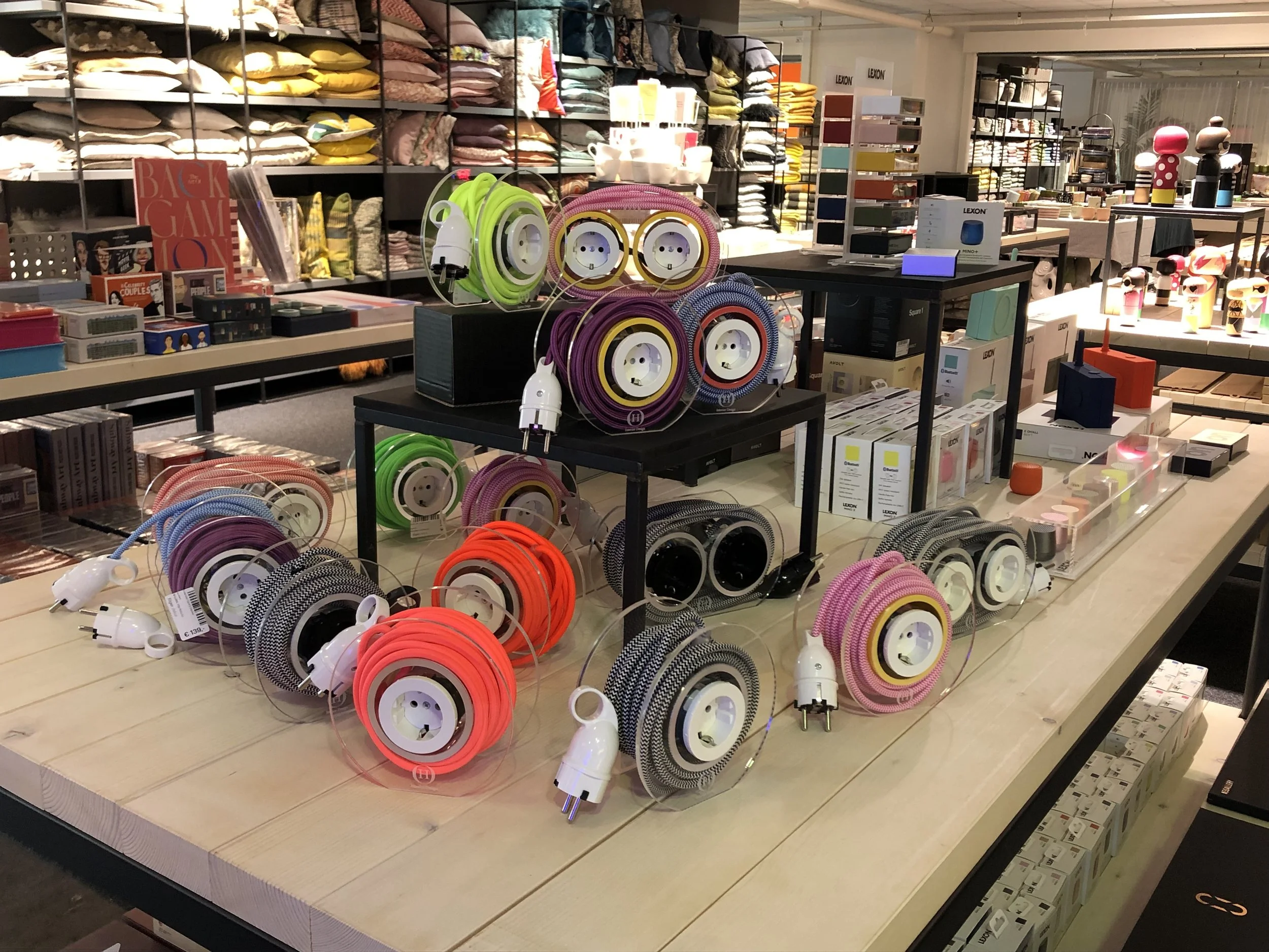 Hier gibt es maßgeschneiderte Verlängerungskabel und upgecycelte Flaschenlampen in verschiedenen Größen.